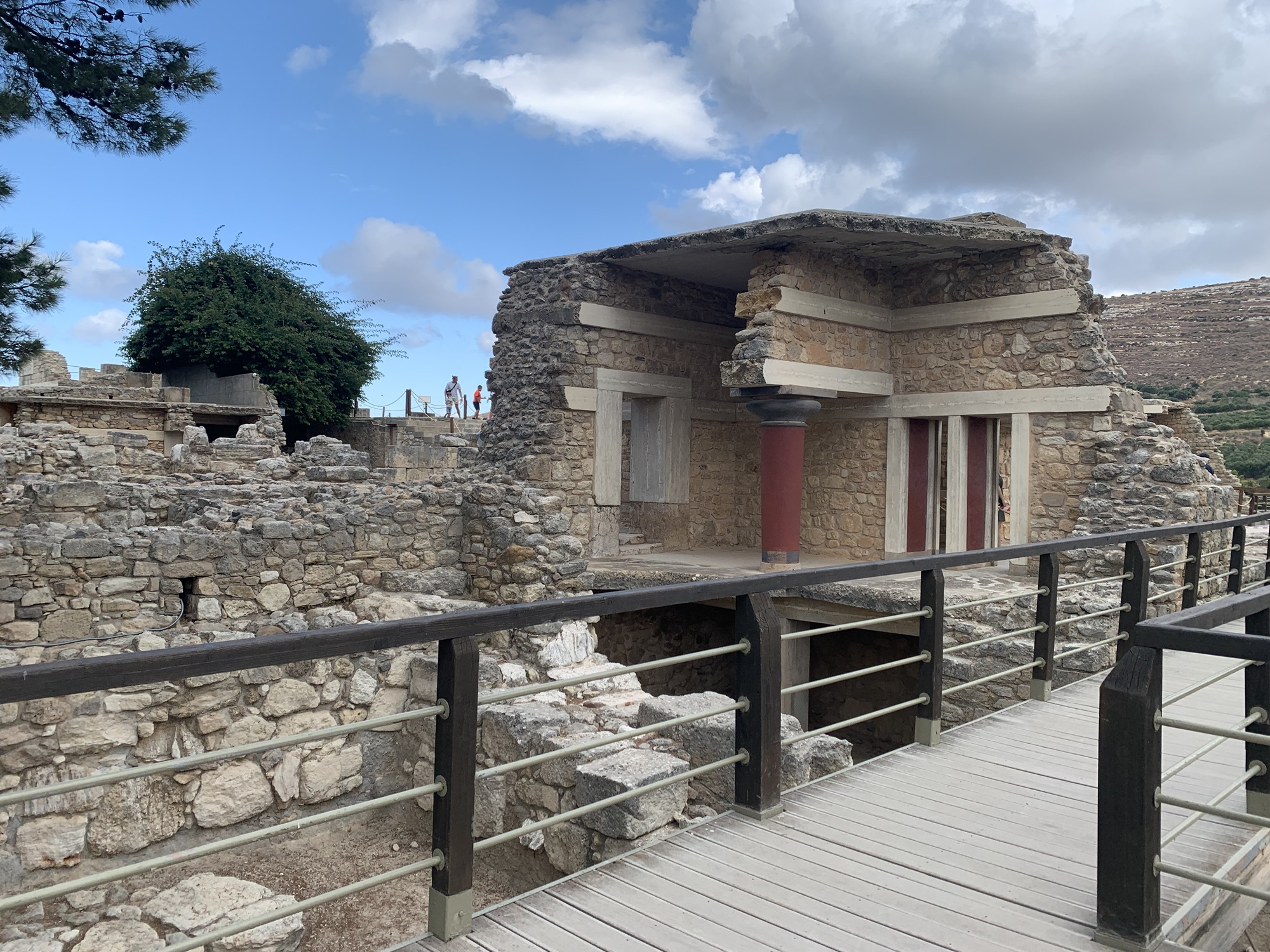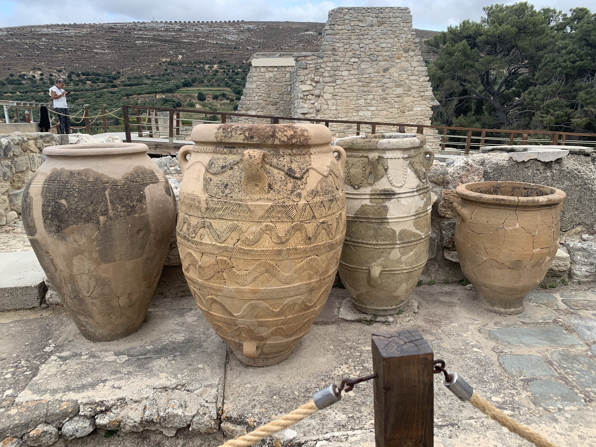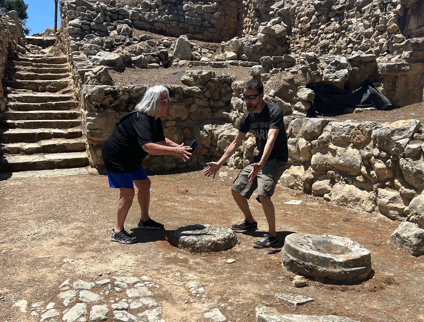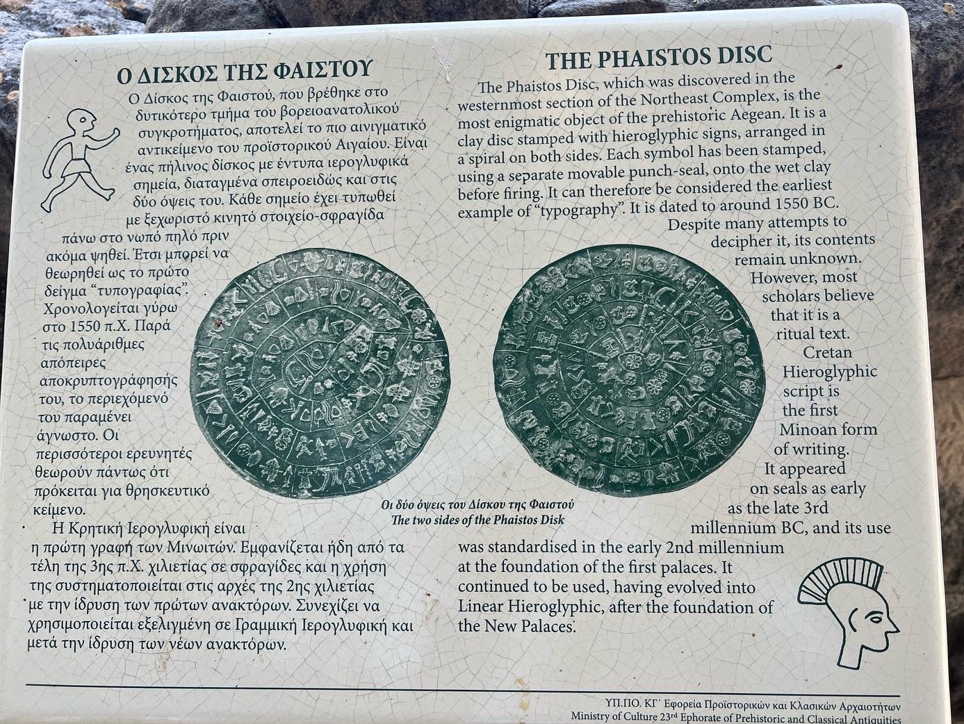 The Phaistos Disc is one of the most intriguing archaeological discoveries from the Minoan civilization on the island of Crete. The disc was discovered in 1908 by Italian archaeologist Luigi Pernier at the Minoan palace of Phaistos (or Phaestos) in southern Crete, in the basement of the palace’s northeastern apartments. The exact dating of the Phaistos Disk is uncertain, but it is generally believed to have been created during the Minoan Bronze Age, likely around the middle or late second millennium BCE, making it over 3,500 years old. As you can see from our visit you can get up close to where the disc was discovered, or even reenact the finding as my husband and friend decided to do…
