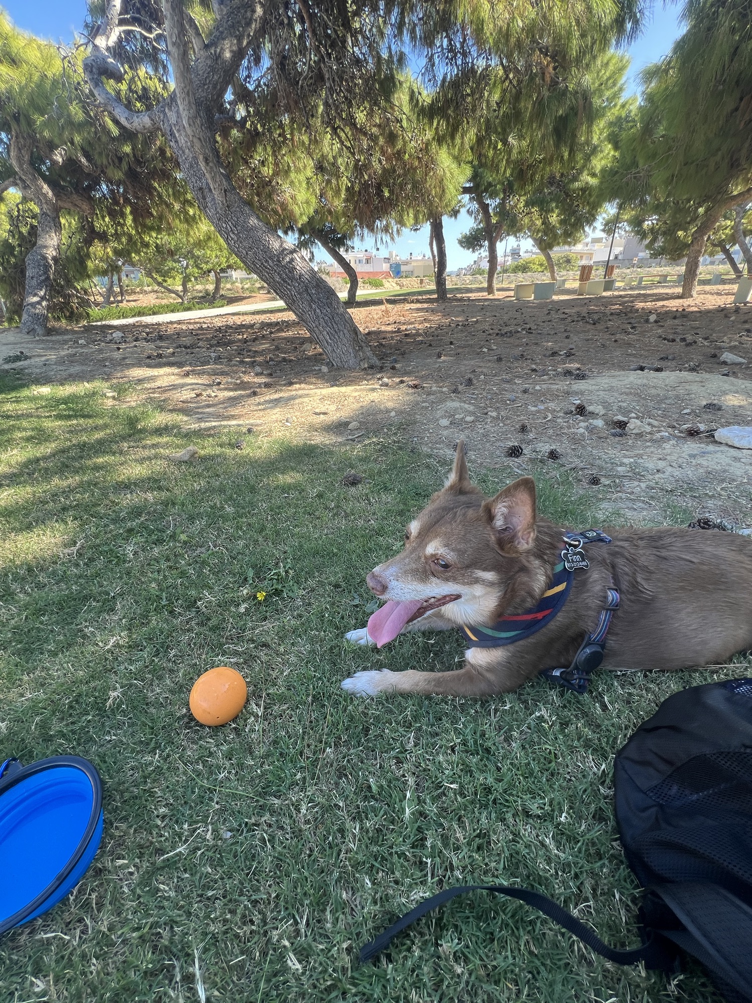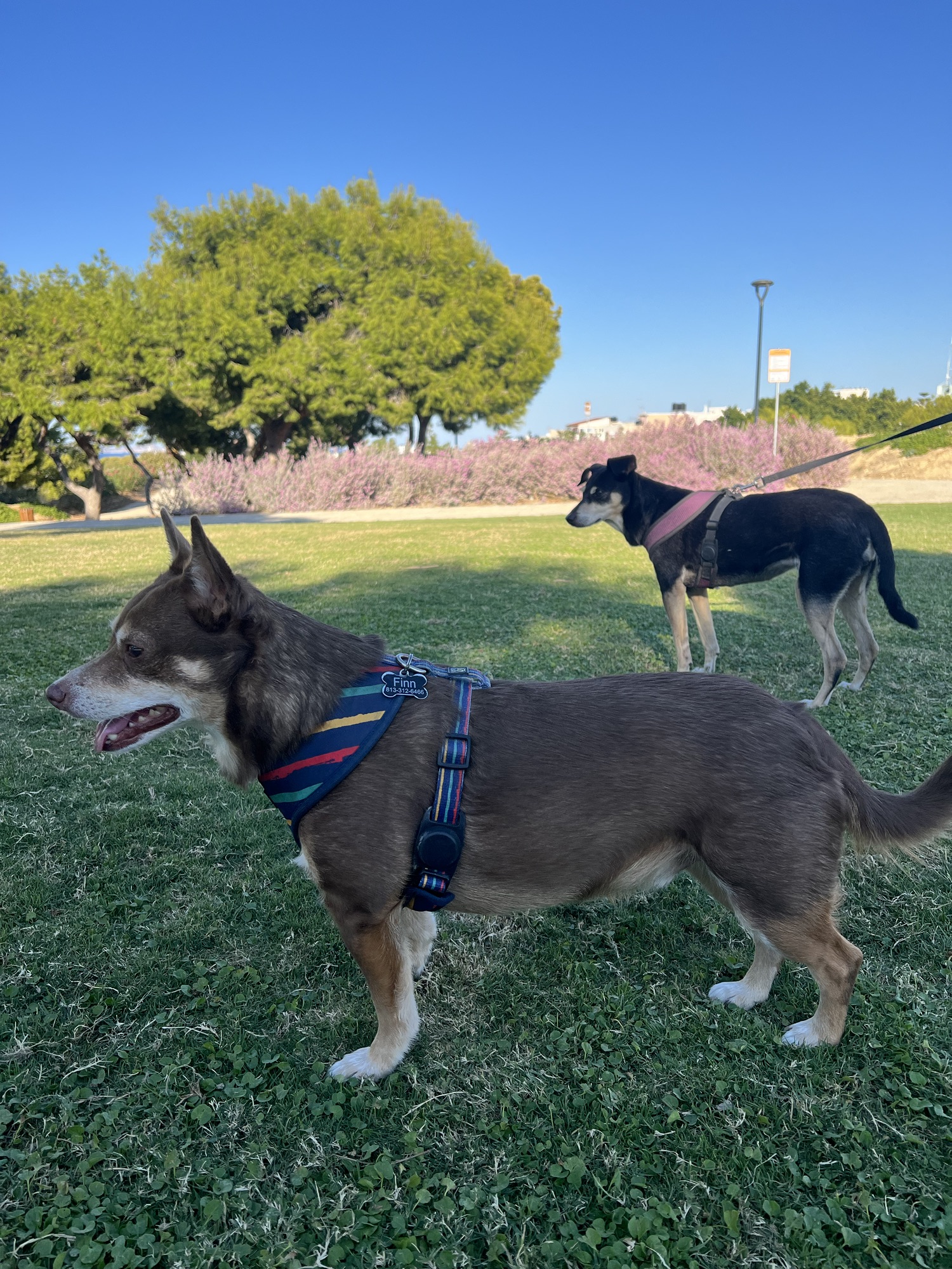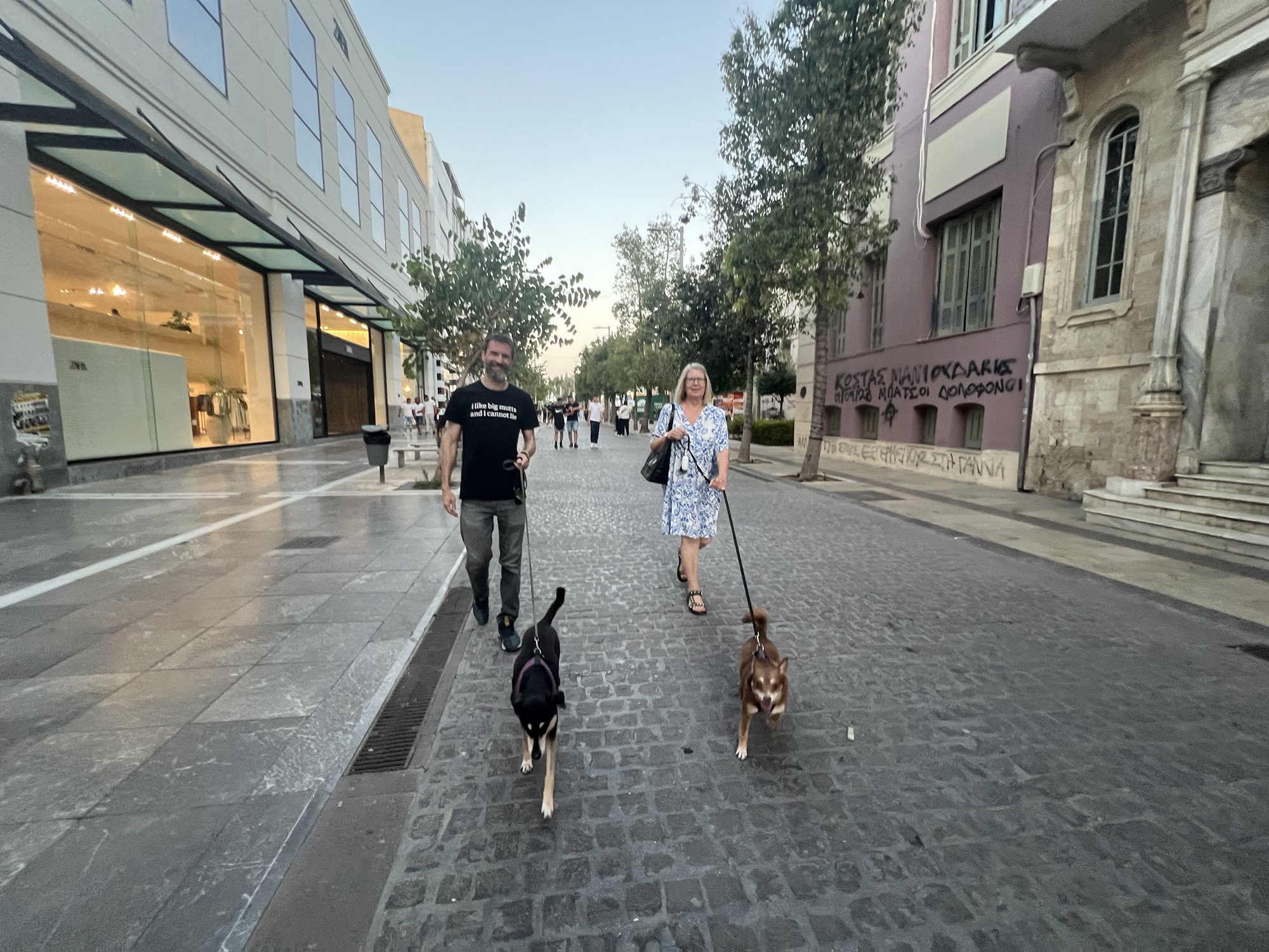 When we arrived at our apartment, we spotted a nice little spot for potty breaks across the street, and we knew there was a bigger park within .25 mile- being in the city center is a bit noisy but has its advantages for the dogs. I will never forget our first few outings- we did our usual walk, trying to avoid other dogs on the leash but the locals were not having it- apparently dog owners here want the dogs to meet, say hello, have a sniff. I was annoyed at first like, let me avoid this meeting so my dog doesn’t lose his mind, but eventually we all got used to the process. Dogs sniff, owners asks – boy or girl, more sniffs, and if Bella doesn’t bark and interrupt, the pups either want to play or say goodbye and move on. Finn has done great with the Greek dogs, mostly enjoying the meetings and getting along with most other pups. Bella, on the other hand, is still a barker, so we walk her around and avoid any meetings still.